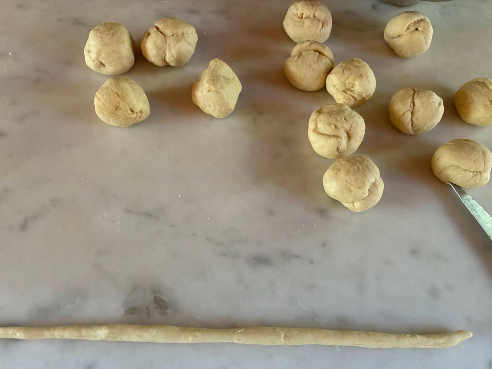 Lorsque la pâte a doublé de volume, formez des petites boules puis façonnez les en fines baguettes .