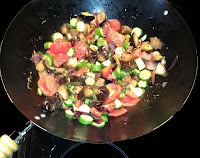 Pendant que l’oignon commence à cuire, couper l’aubergine en petits dés au dessus du wok, puis remuer. Faire de même pour la courgette, et remuer.